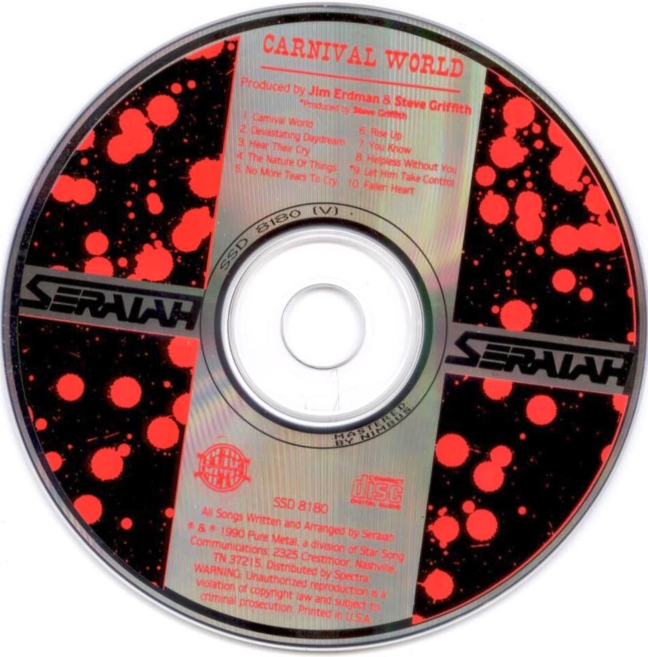 My older brother worked in a Christian bookstore in the mid to late 90's and he was responsible for introducing me to many bands, including Seraiah. I believe he brought home the cassette demo one day for their first album, Carnival World. Part of the Star Song imprint, Pure Metal, this was a little heavier album that was I was accustomed to listening to at the time. I used to classify then as speed metal...but that was before I was introduced to Tourniquet! I haven't listed to this album in a very long time as I just don't mess with cassettes these days. I've always wanted to own this album on CD, but the secondary prices were more than I wanted to pay. Thankfully luck would be on my side as I found a seller that had the CD and album cover for just $.99! Much better than the $25-$35 some eBay sellers want. Because of this I sadly don't have the back art scanned in above.